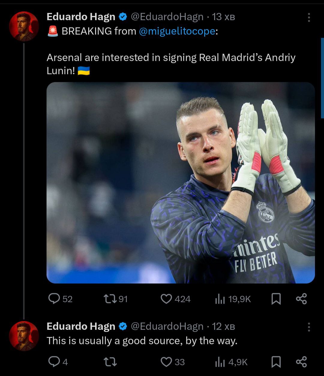 Ну по стате Лунин в плане передач на уровне Райа. Но при этом еще спасает от голов, а не привозит их. +Моложе