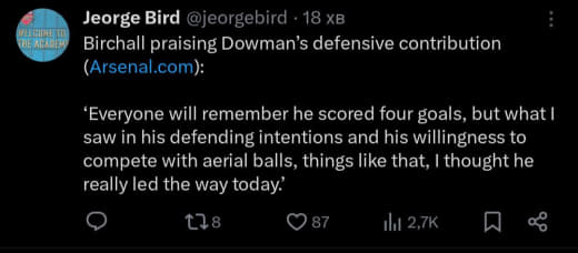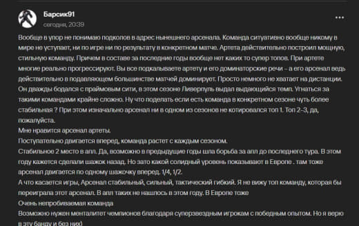 Я во всех этих нарезках голов не вижу беготни без мяча. В игре против нас я запомнил его 1 прорывом, в остальное время он искал сокровища у себя в носу и в ухе. Будет ли Артета его использовать исключительно за его сильные стороны и забьет на базу которую выстраивал столько сезонов? Я вот с трудом себе представляю что теперь мы будем играть с человеком который не возвращается до нашей штрафной.