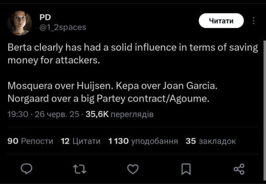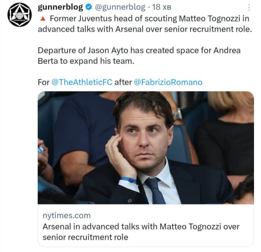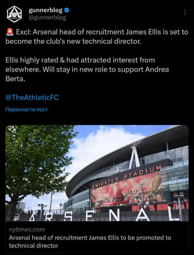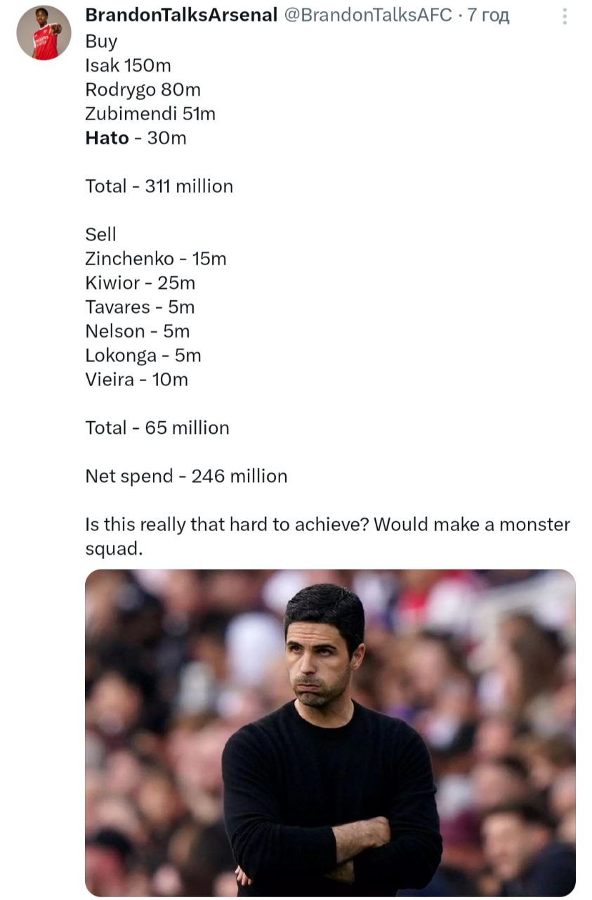 Всё больше верю в то, что клуб не устраивало что Эду и Артета воюют в разные стороны и дали Микелю директора который будет настроен на то чтобы помочь нашему менеджеру собрать его состав. Хотя Эду сам ушел, причём внезапно и неожиданно, но это другая история.