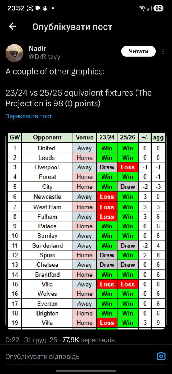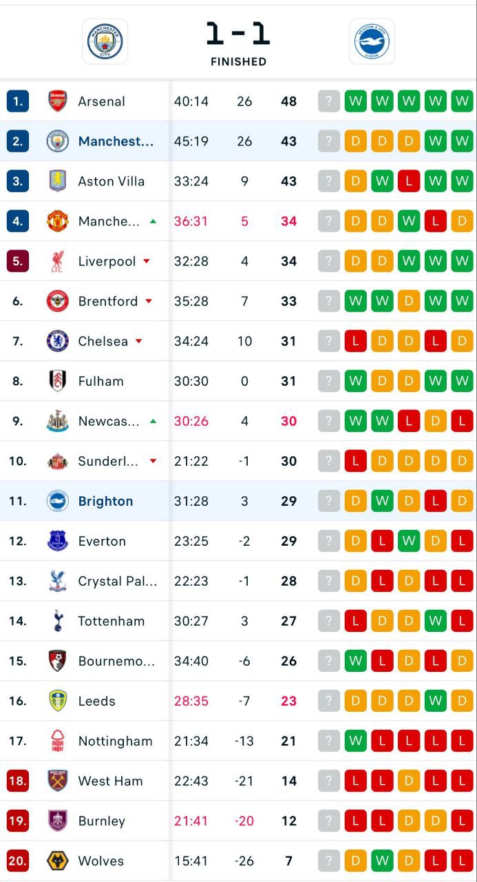 Кроме шуток, 6 очков отрыва сейчас — это прям мало, одна потеря и будет уже тревожно. Еще как могут аукнуться пять очков, потерянные на Эмирейтс против Ливерпуля и МЮ. Вот это были реально катастрофические потери, как вообще не смогли забить этому Ливерпулю ни разу?
