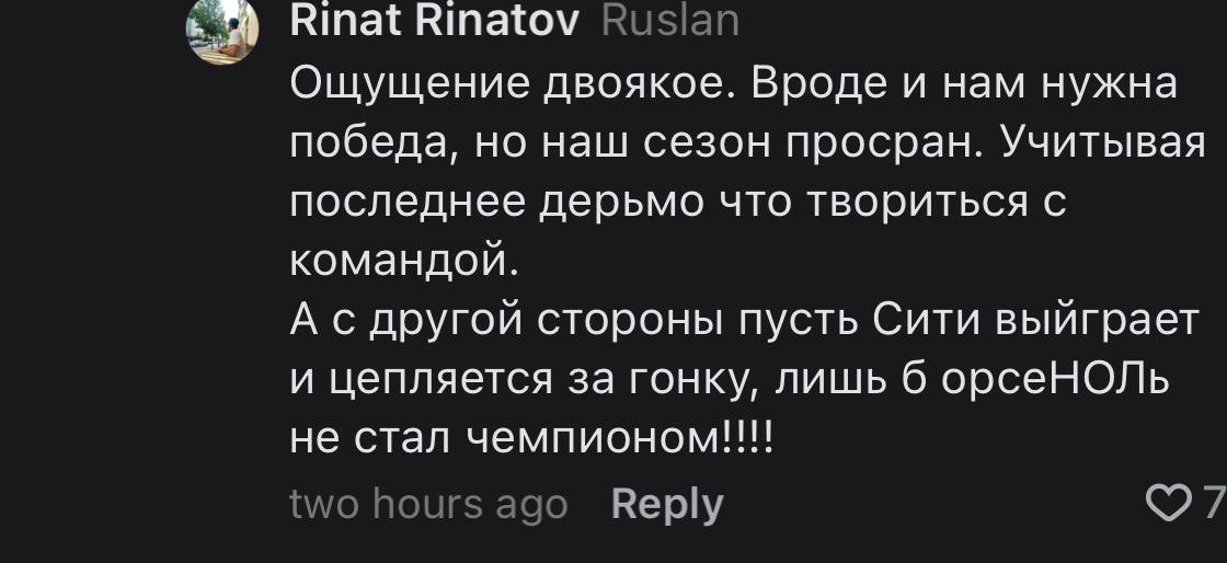 Ну так они у Арсенала есть, как мы знаем. К сожалению. Когда нужно забить мертвой Баварии Тухеля за 30 минут — обязательно не забьем. Я из-за этого переживаю. Что в решающий момент снова не вытянем