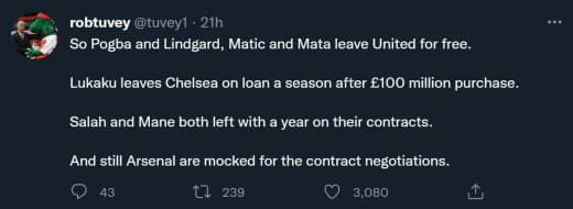 Но эти уходы и наше нынешнее положение нельзя сравнить с 2007 годом условно говоря. Тогда арсенал мог тратить только копейки на усиление, плюс не мог зарплатами конкурировать с другими клубами. С десяток клубов тогда могли нашим игрокам дать в 2-3 раза больше денег. И что у игроков было, с одной стороны большие деньги и возможность выиграть трофеи благодаря тому, что те покупают лучших игроков и удерживают своих. С другой ЗП гораздо ниже и только сумасшедший дед, который теряя лучших из лучших, имеет возможность заменить их только детьми и при этом держится в топ четыре. Плюс ещё за это получает хейт от болельщиков и СМИ, что он не выигрывает все трофеи. Плюс ещё и команде это перепадает.